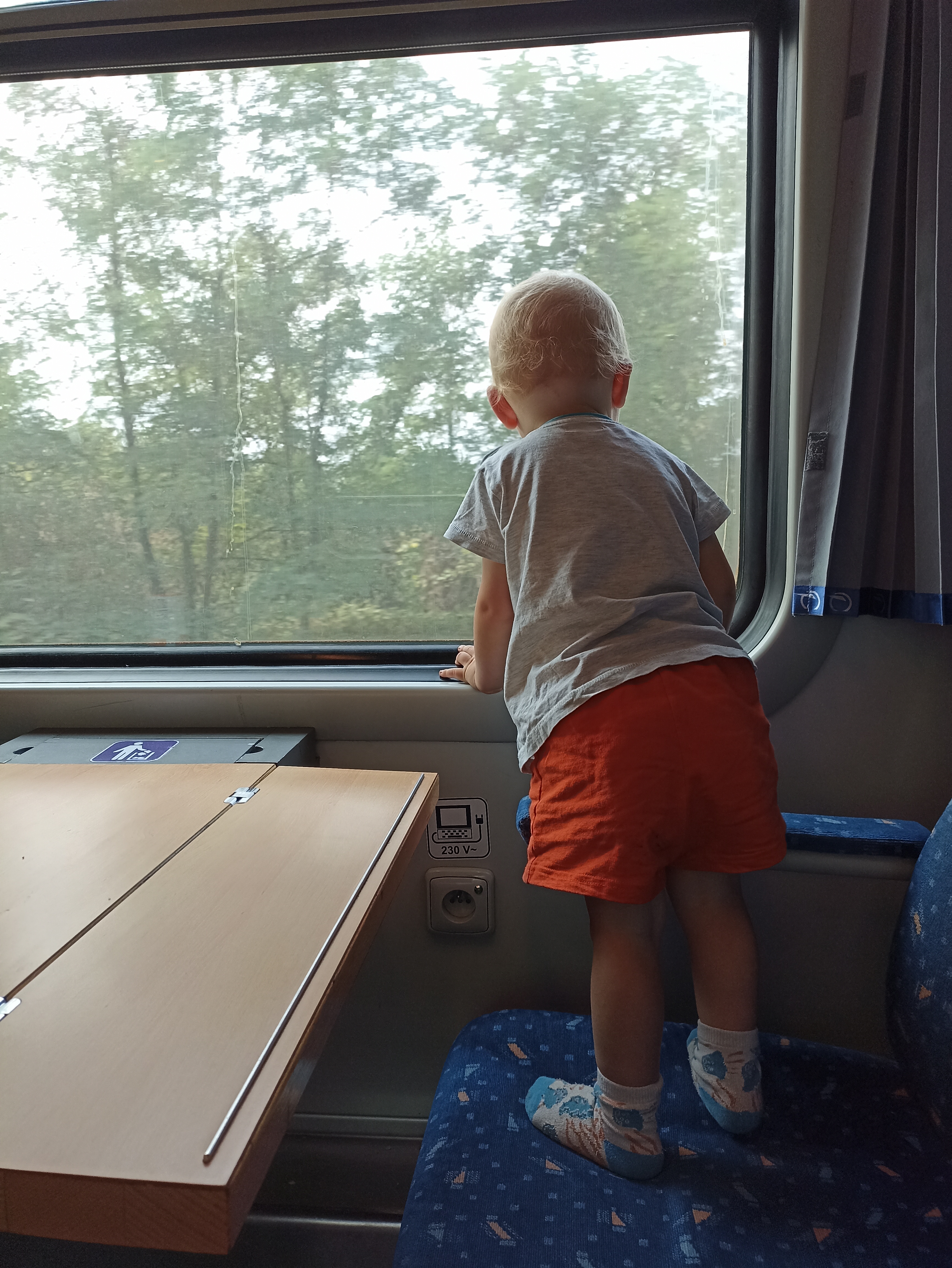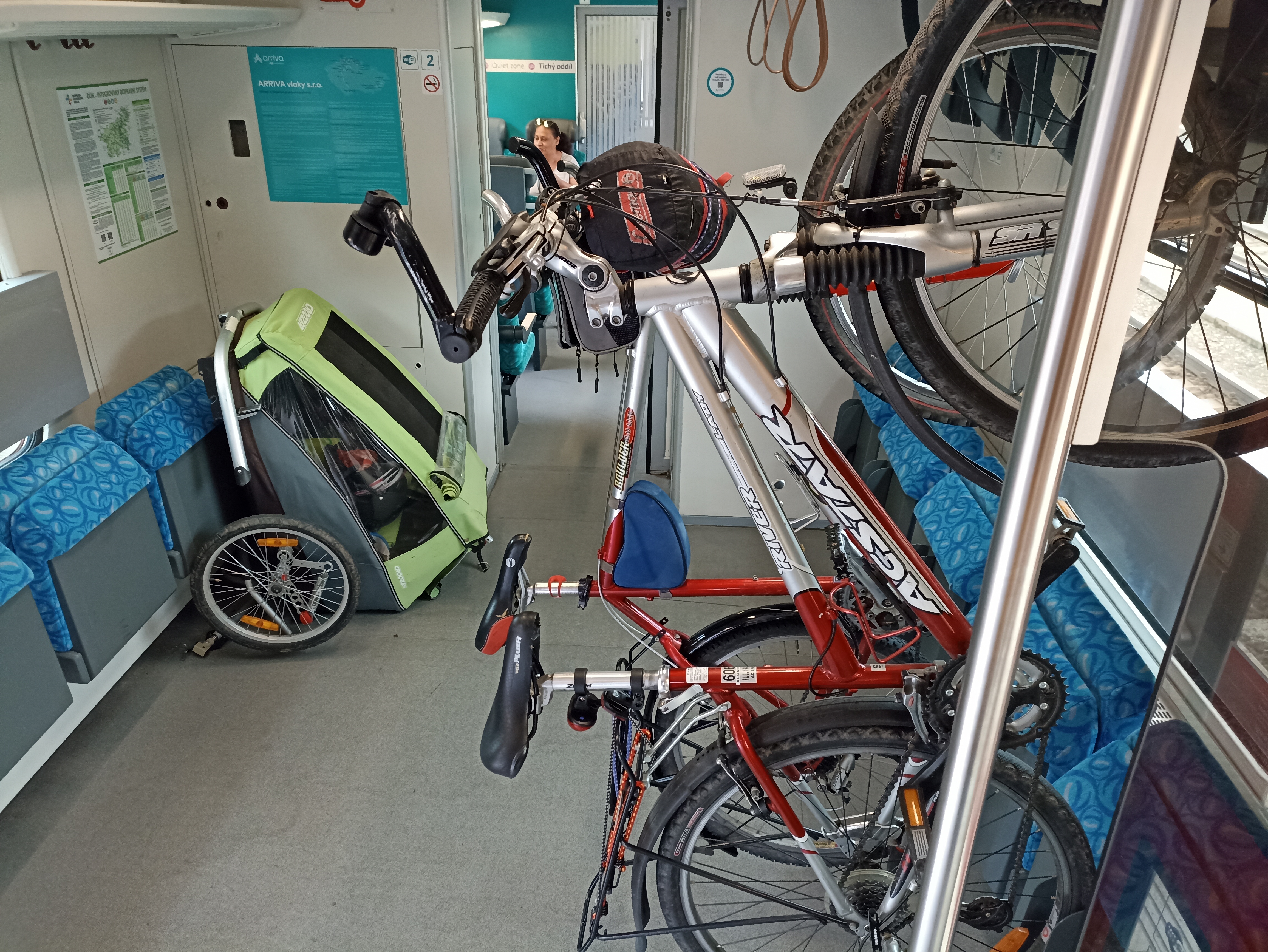 Tentokrát jsme měli rezervovaný oddíl pro kola umístěný zároveň s oddílem pro vozíčkáře, což tedy následovníkům doporučuji!, protože tento oddíl má dveře jako vrata od stodoly a není potřeba nic odstrojovat, ani vkládat ježka do klece.