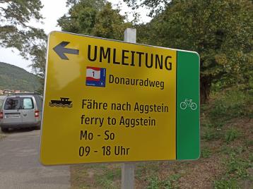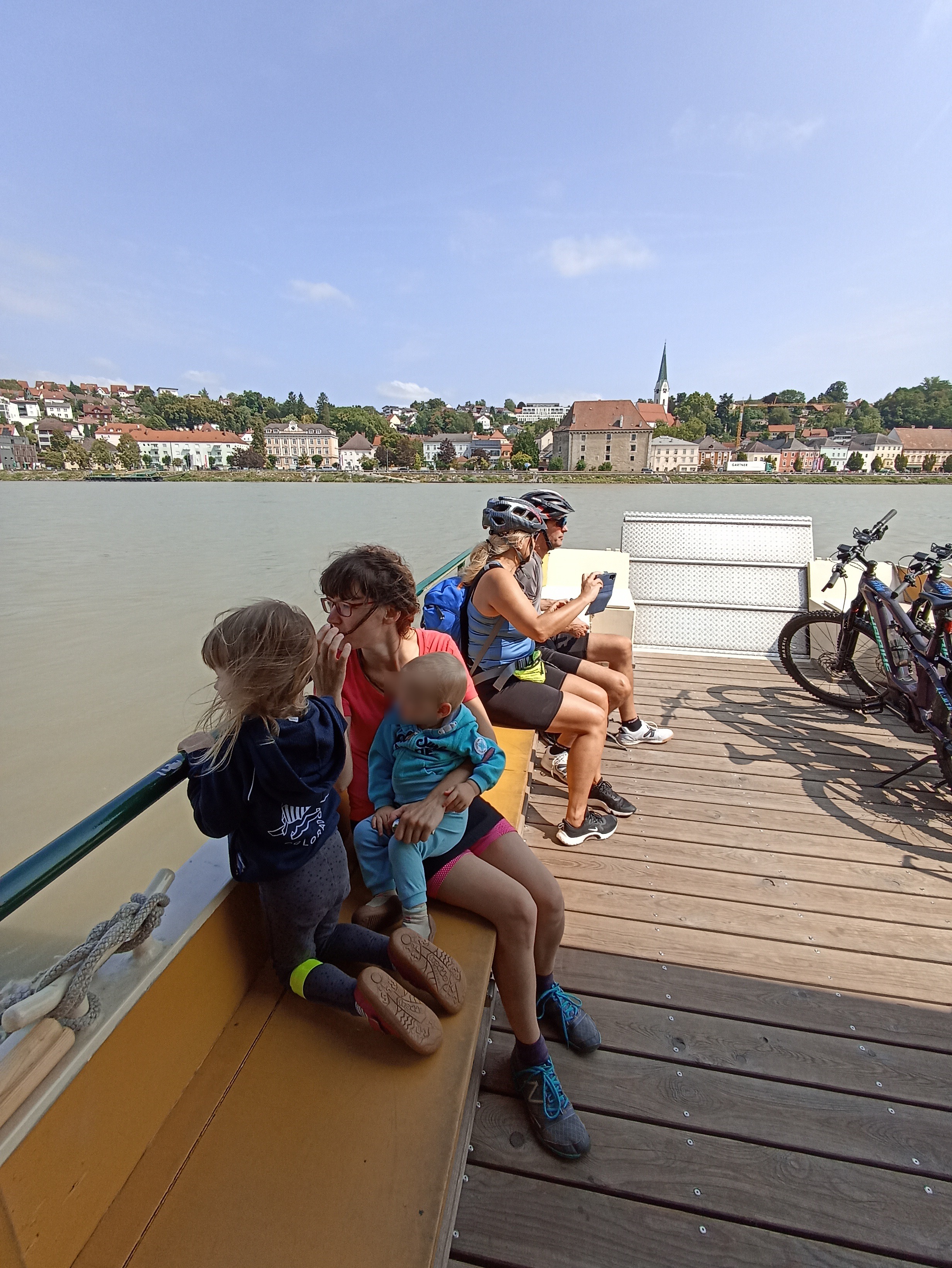 Pak nás čekal poměrně krátký úsek z velké části z kopce, než jsme se dostali do místa, kde z důvodu závalu stezky i silnice byla zavedena náhradní lodní doprava. Bezplatná. Ten zavalený úsek bylo potřeba objet 5 km přívozem. Naštěstí jsme byli první na řadě, takže jsme nemuseli čekat frontu a během 5 minut dorazila loď. Na přívozu u Mauthausenu vozík nebyl problém. Tento přívoz byl stísněnější, s méně šikovným molem, takže naložit všechny naše dopravní prostředky a děti byla výzva. Ale po nepřiměřeně dlouhé době se to s pomocí postaršího vůdce plavidla nakonec povedlo.