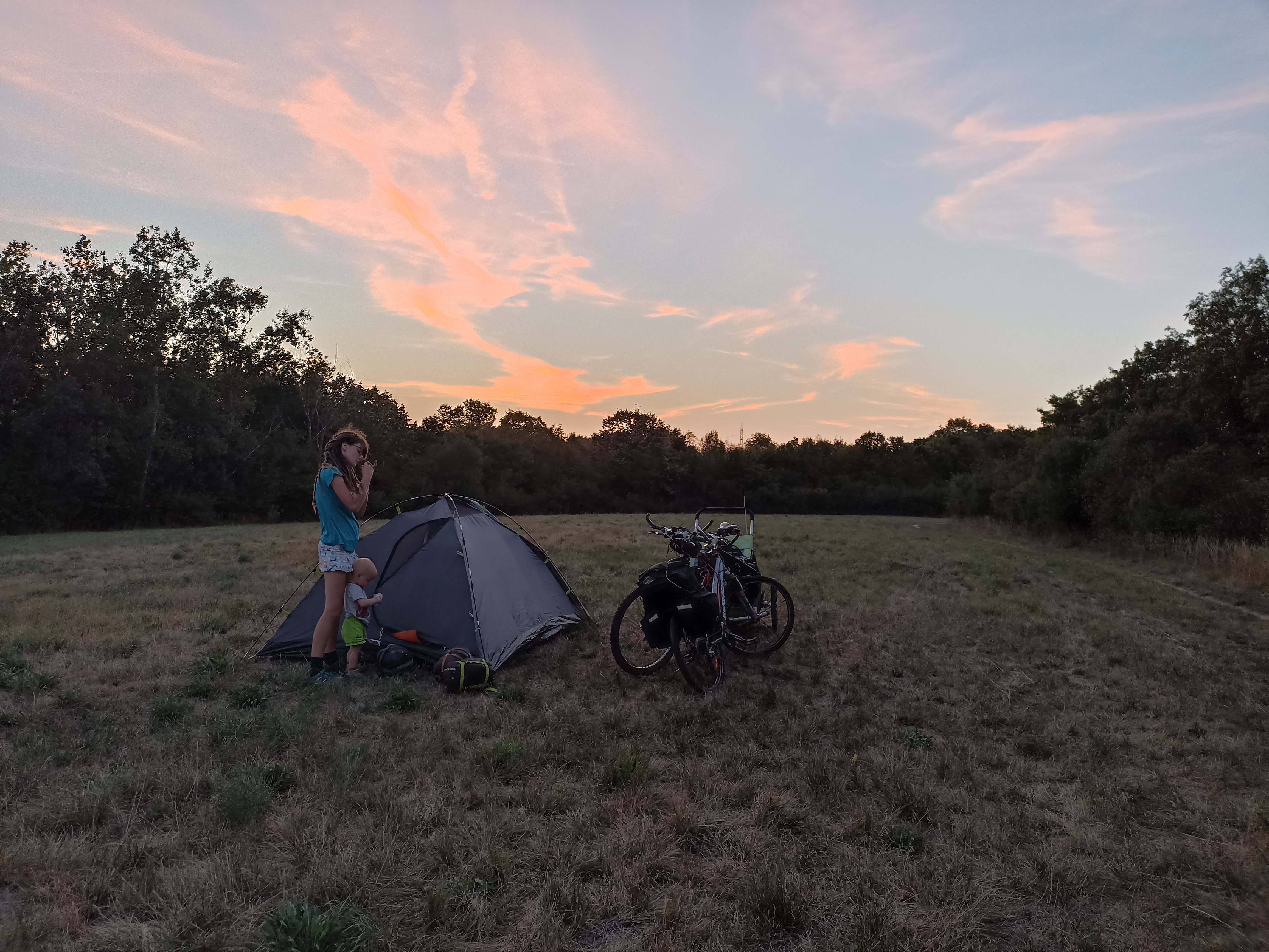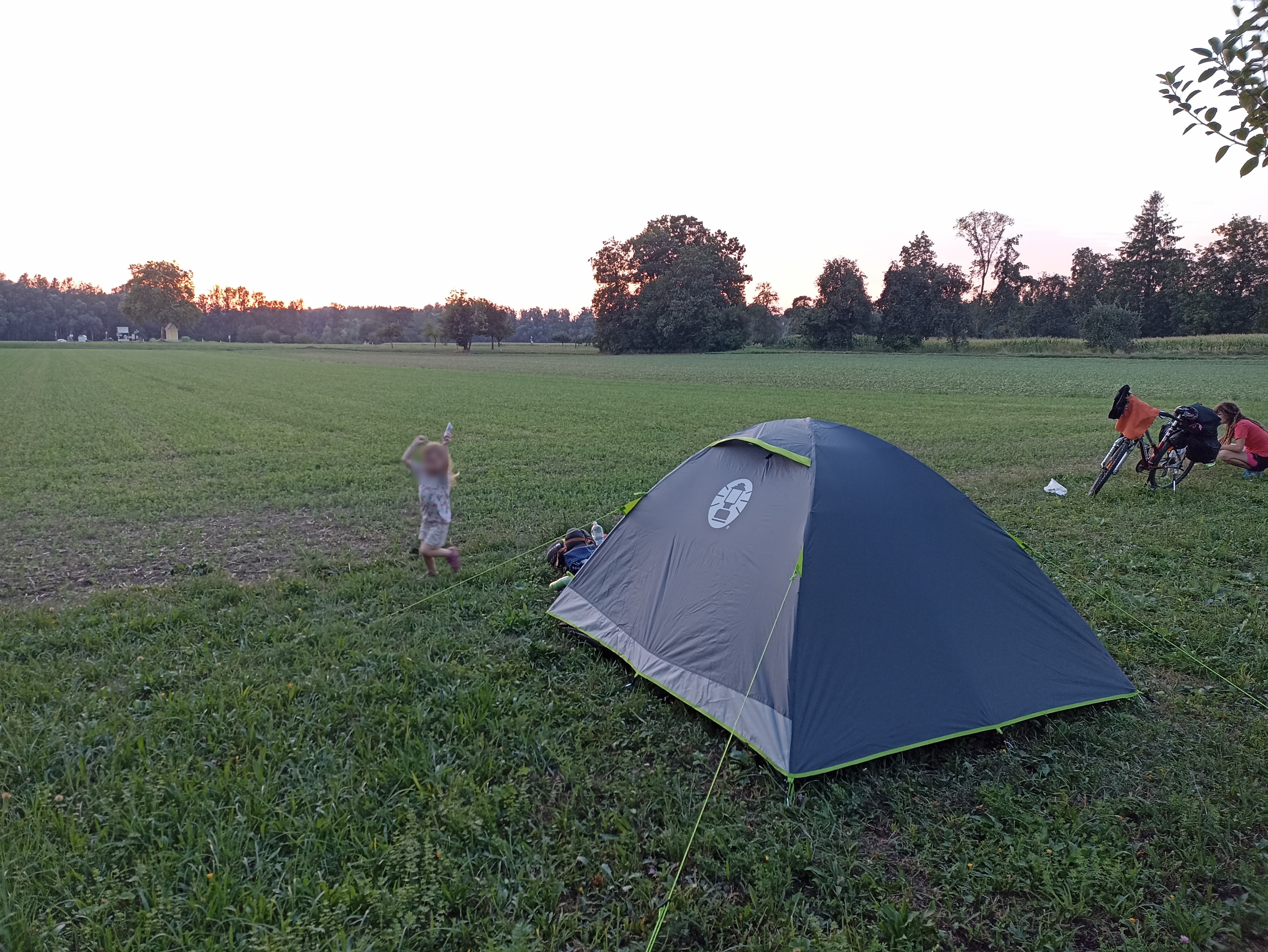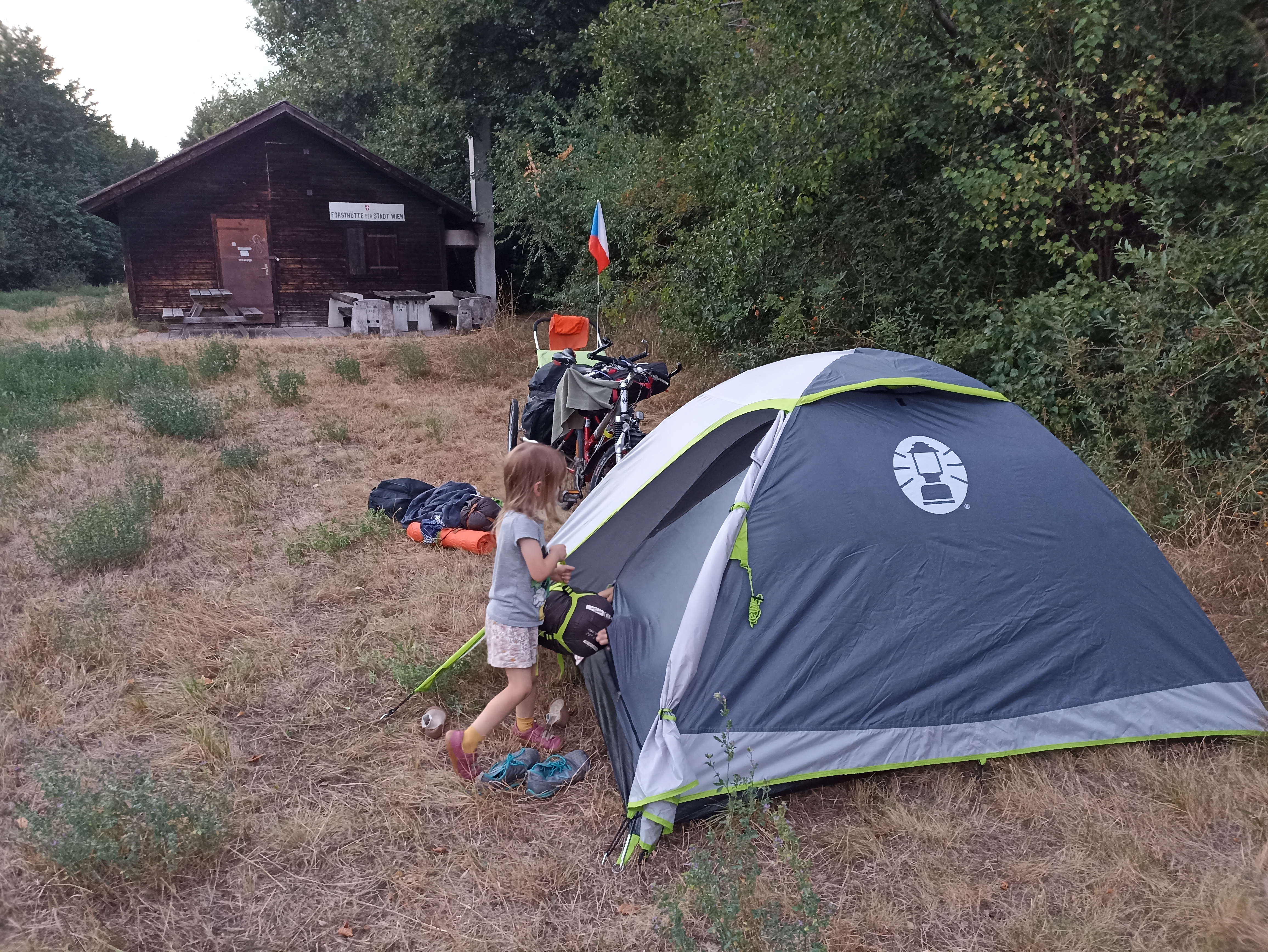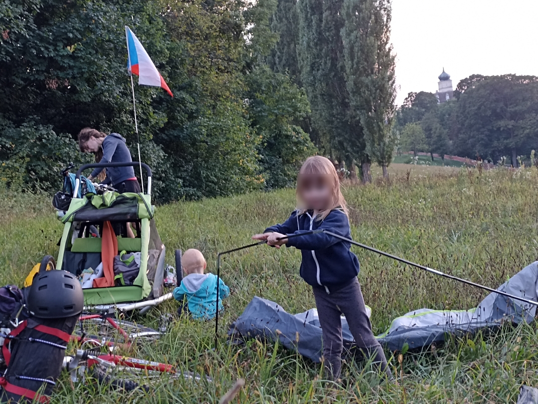 Jsme na hrázi vedle Dunaje, kde jsme se i přes zákaz vykoupali a pak postavili stan (to tu snad zakázané není). Se stavbou a úklidem stanu ráda pomáhá i Madlenka, kterou jindy přimět k pomoci s čímkoliv je dost obtížné.