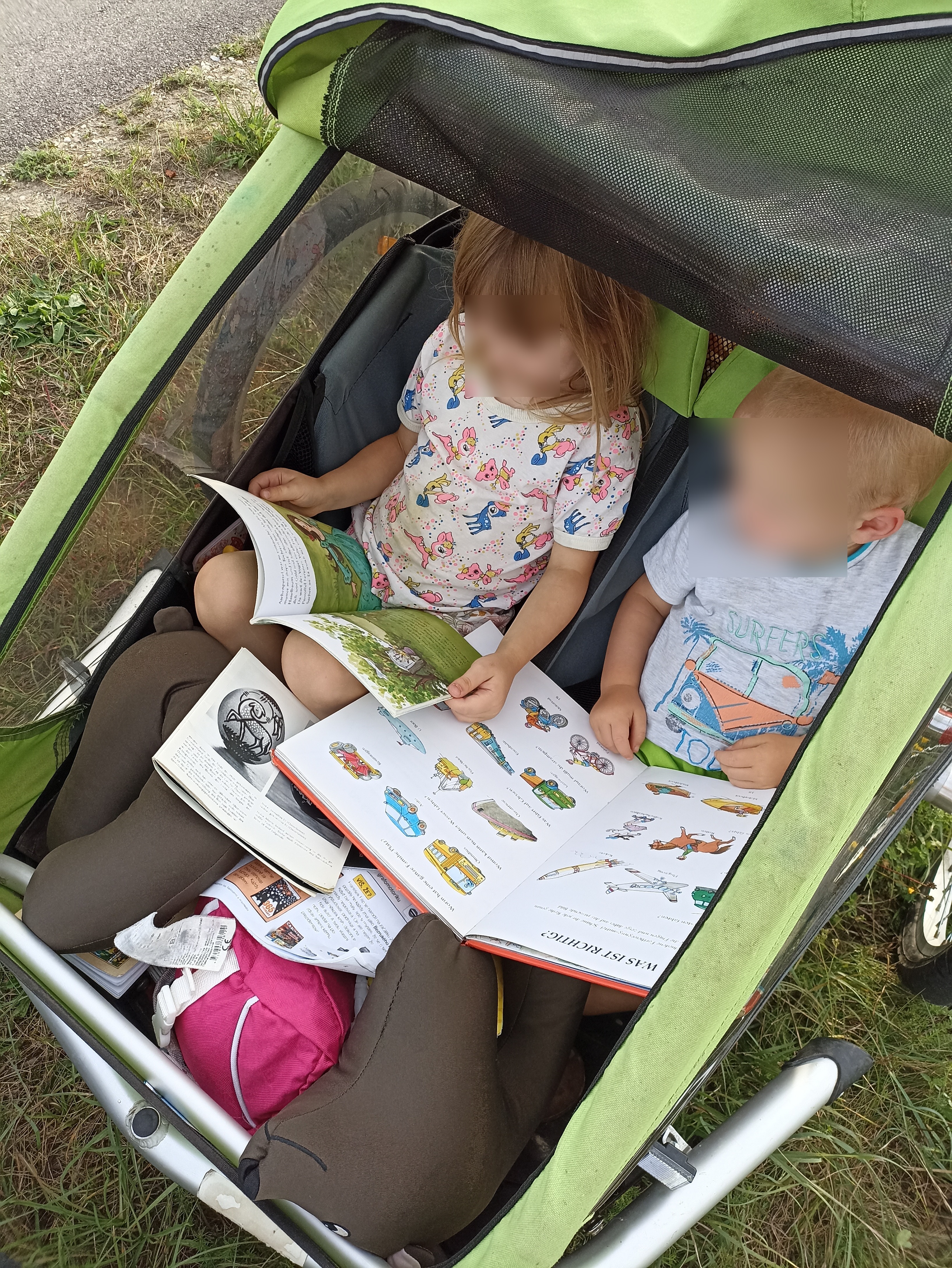 Zakončeme to dnes ještě obecnou poznámkou o tom, jak děti snášejí cestu ve vozíku. Snažíme se, aby v něm netrávily více než 3,5 hodiny denně a ten čas mají vyplněný hlavně spánkem a "četbou". Obě děti naštěstí skoro od narození leží v knihách. Tomu, aby je knihy, co máme s sebou neomrzely pomáhají knihobudky. Pocestná čas od času u nějaké zastaví a udělá obměnu knih. To, že jsou německy, jim zatím nevadí. Je to vlastně hloupý věk, ten od 6 let do puberty, než se naučí druhý jazyk - je to jediné období, kdy cizojazyčné knihy jsou člověku naprosto cizí. Naštěstí v něm ještě nejsou.