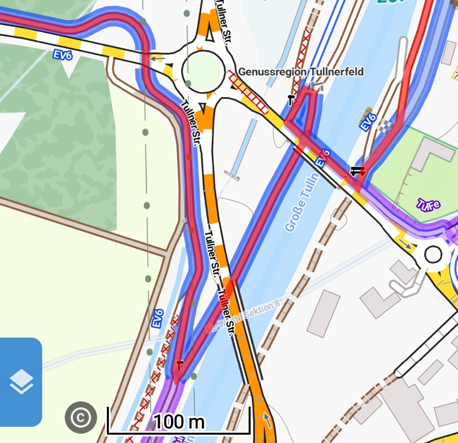 Během předchozí věty jsme profrčeli městem Tulln, jehož nábřeží vypadalo dost dobře! Úplně jak nejlepší mořská letoviska. Město si tím skvěle napravilo negativní první dojem z frustrujícího vedení cyklostezky kolem křižovatek před městem. (Snad brzy) viz obrazová příloha a vězte, že každé překonání silnice je formou podjezdu, a tedy s pomocí zbytečných prudkých stoupání. Tím, že jsme z města neviděli příliš, rádi se ještě někdy vrátíme na delší návštěvu.