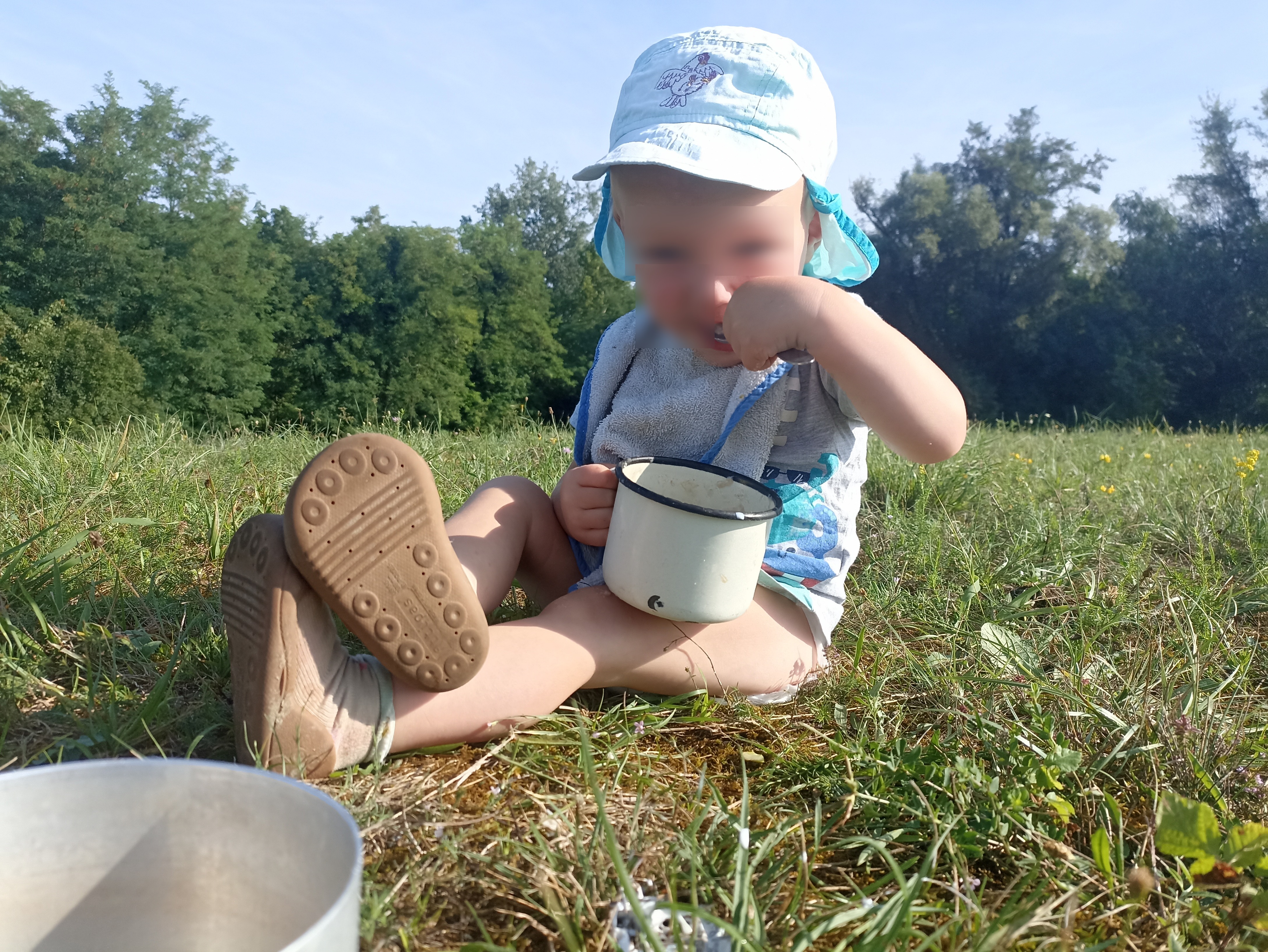 Vzhledem k tomu, že na hřišti byl i kohoutek s vodou, rozhodli jsme se rovnou uvařit i oběd - instantní těstoviny s rajčatovo-mozzarelovou omáčkou. Po obědě jsme si s Madlenkou museli zahrát na to, že Mojmírek (jaký, to nevíme) má oslavu.