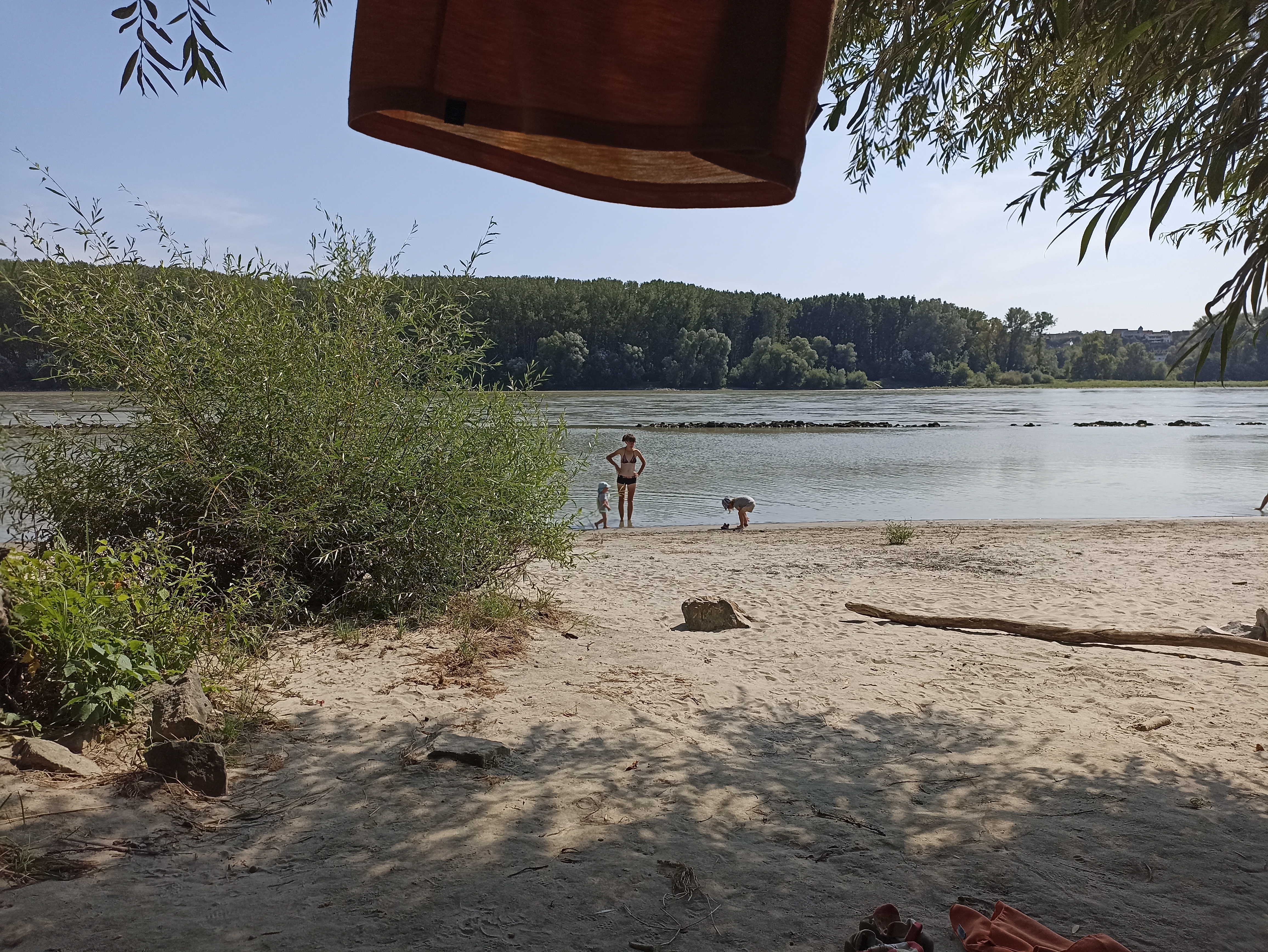 První polovinu dne Pocestné přálo štěstí. Foukal příjemný povítr, takže cesta ubíhala a pocitově nebylo velké vedro. To se ke slovu přihlásilo až ve chvíli, kdy jsme odbočili z hlavní trasy, abychom zastavili u Humers Uferhaus, což je patrně vyhlášená restaurace. My však směřovali hlavně na přilehlé dětské hřiště. Bylo v podobě ztroskotané plachetnice, což děti zaujalo. Rozhodli jsme se tedy zdržet déle a uvařit si i oběd. K němu jsme si z restaurace donesli weissbier a měli se dobře. Po obědě jsme se posunuli párset metrů po proudu Dunaje najít místo ke koupání, abychom se před další cestou opět zchladili. Našli jsme luxusní písečnou pláž s klidnou vodou, což zajišťoval kamenný... ...no, ne vlnolam, ale proudolam.