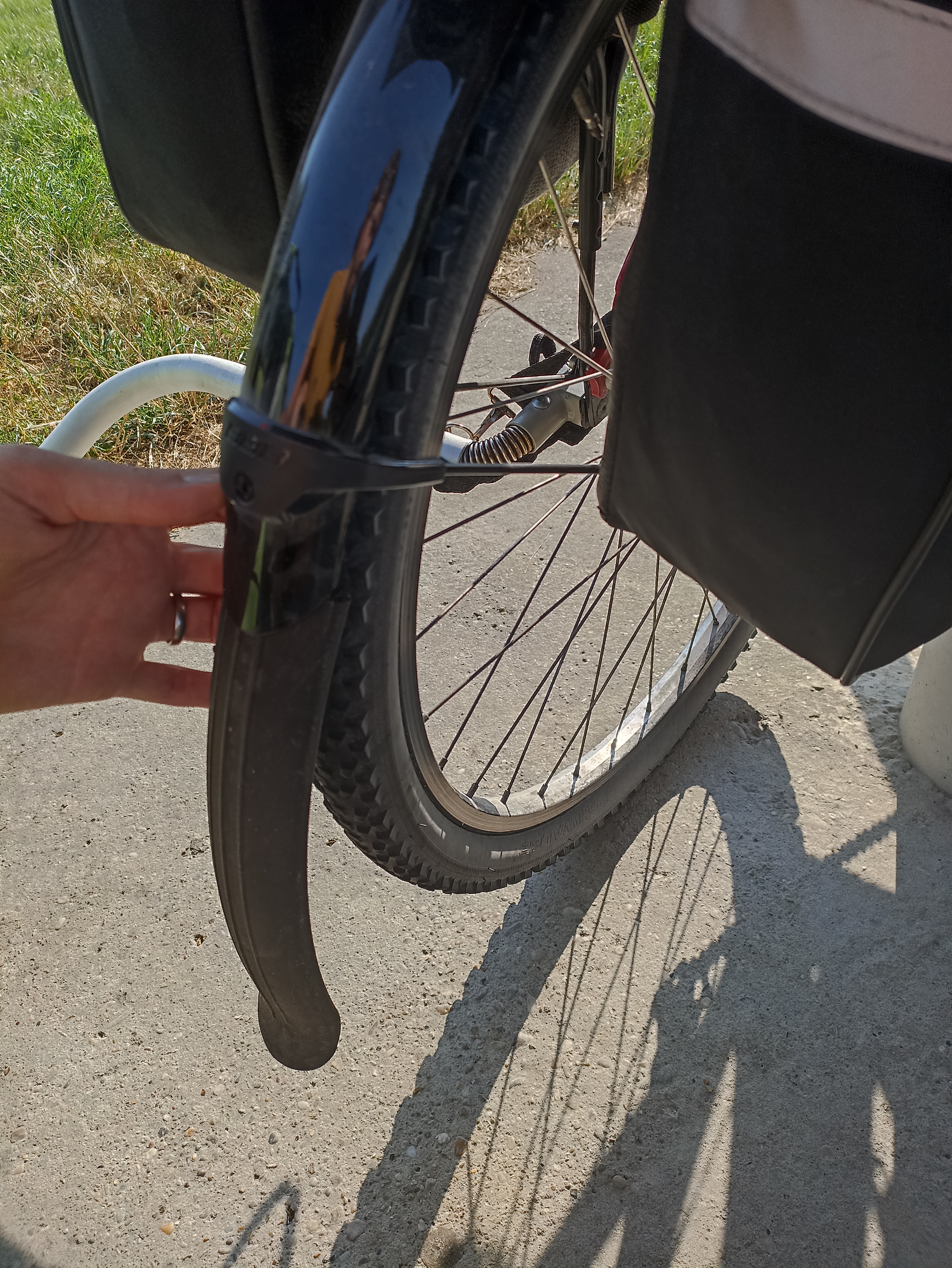 Dále jsem kolo musel doplnit o nosič z Decathlonu (ti si ho nechali zaplatit, a proto žádný kód nepoužívejte) a blatník z nějakého cykloobchodu, který si nepamatuji. Blatník nemám ani tak z důvodu vlastního pohodlí, ale kvůli vozíku, na který létá od zadního kola úplně všechno. Nejlepší blatník by byl takový, který by sahal až těsně k vozovce, ale ten jsem bohužel nesehnal. Vylepšil jsem tedy standardní blatník o sundavací-a-zas-tam-dací nástavec, který jsme sice na cestě bohužel nepoužili, ale pro účely fotodokumentace jsem naznačil jeho instalaci.