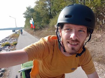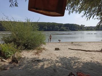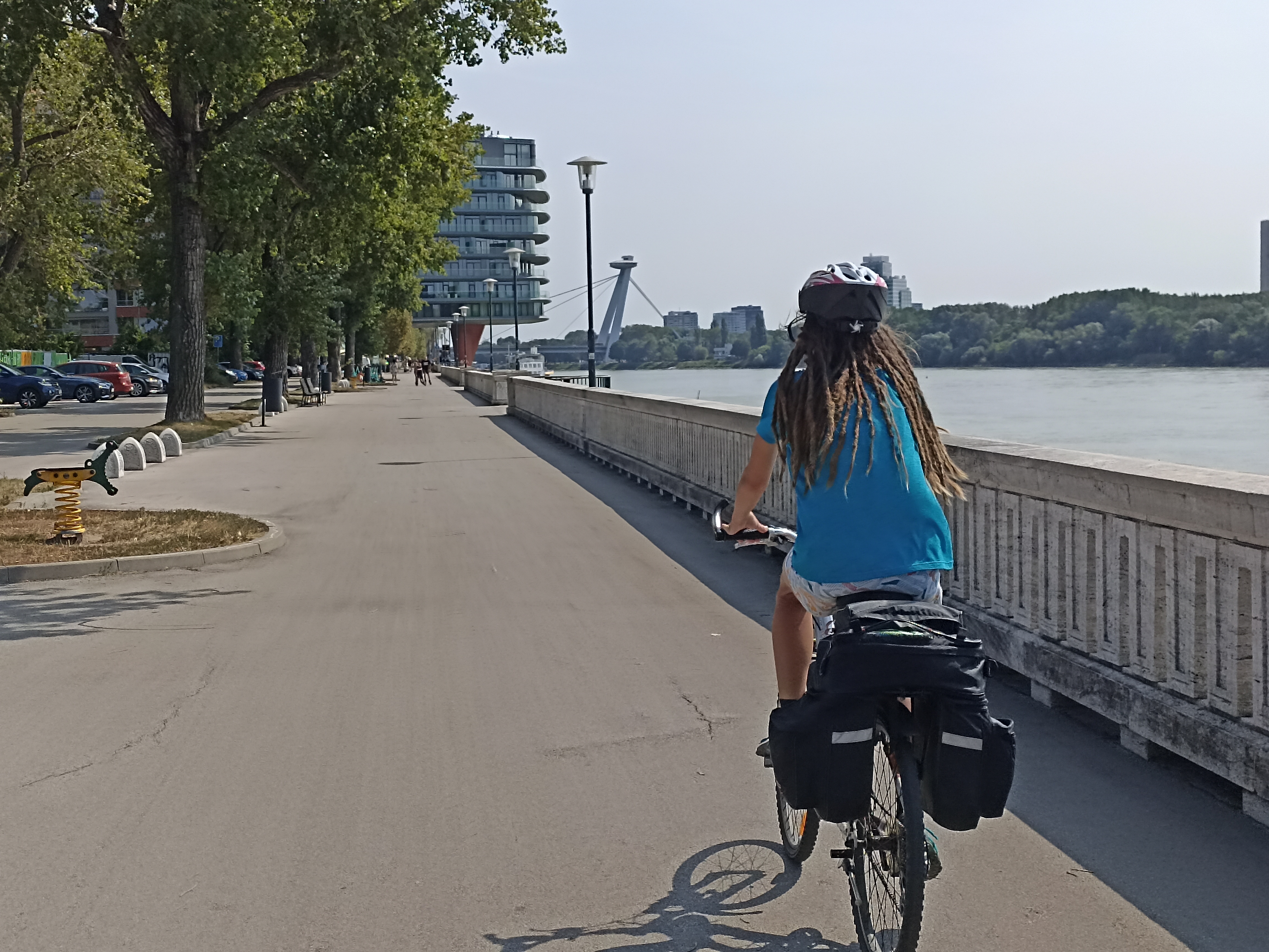 Zastávka po maratonské etapě proběhla na jediném hřišti široko daleko. Bylo sice zanedbané, ale dětem to bylo jedno a nakonec si docela vyhrály a já se zchladil v Dunaji. Po dlouhé pauze jsme vyrazili dále. Překonali jsme zase Dunaj a pokračovali tentokrát po jeho levém břehu 10 km k dalšímu hřišti.