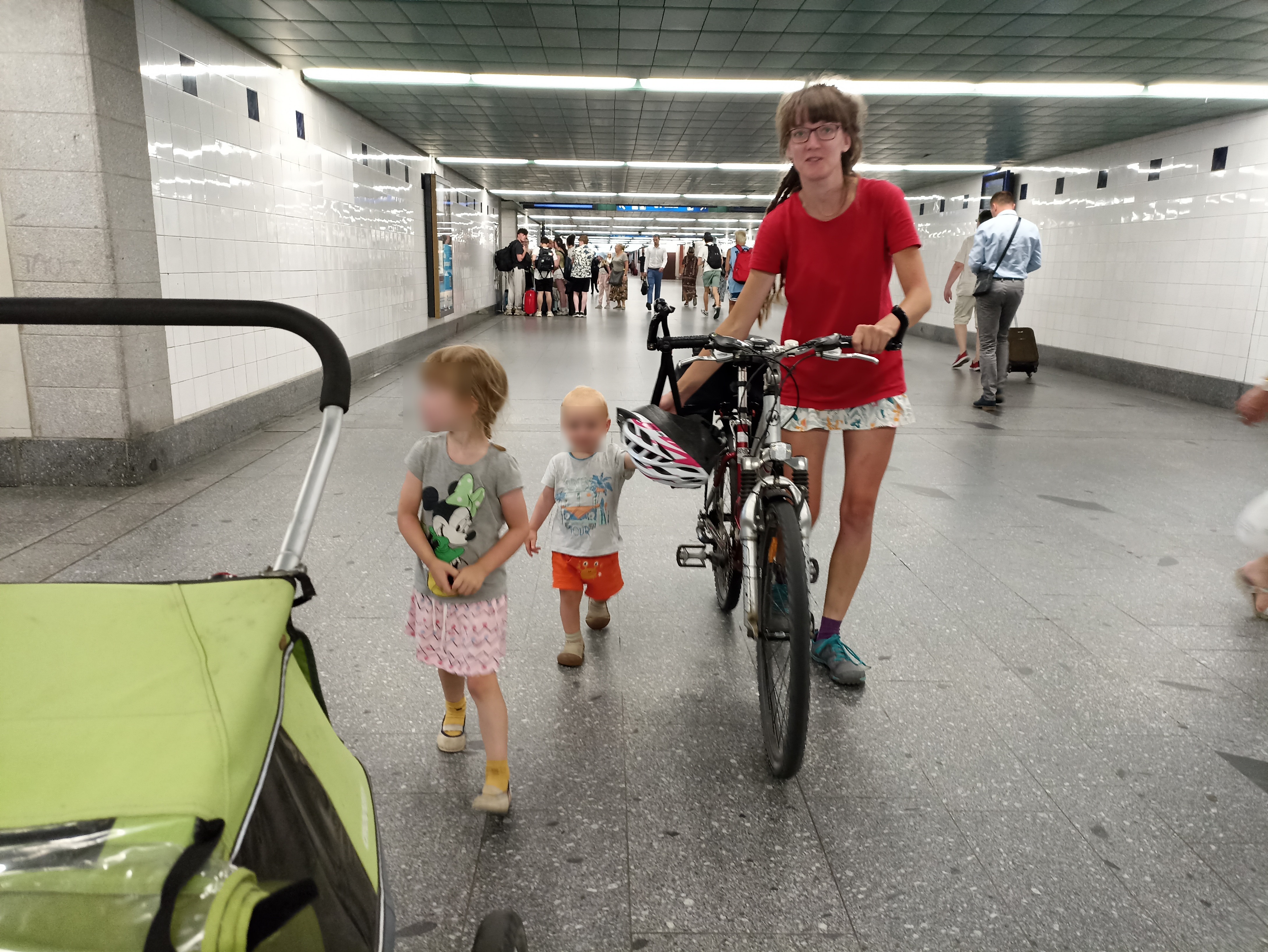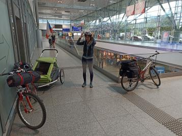 Příchod na Hlavní nádraží ve mně vyvolalo obavy... První nástupiště v úrovni hlavní budovy, další po schodech dolů a pak zase nahoru... To jsem zvědav, jestli dokážeme kola, vozík, děti a brašny přenosit od chvíle, kdy vyhlásí nástupiště do odjezdu vlaku... Naštěstí, po 15 minutovém průzkumu a hlavně dotazování staničního personálu se mi podařilo najít luxusně velký výtah, do nějž se vešlo kolo i se zapřaženým vozíkem, a to problém vyřešilo. Během čekání na 20 minut zpožděný vlak jsme se snažili pomoci Vietnamci mluvícímu jen vietnamsky, zorientovat se v evropském železničním systému, aby byl schopen nastoupit do 50 minut zpožděného vlaku na Budapešť.