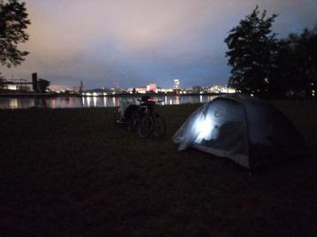 Cílem bylo dostat se z Vídně a při volném toku Dunaje postavit stan. Jenže, když jsme měli opouštět ostrov, nebyla před námi cyklo-lávka, ale lávka s mnoha schody. To nás morálně zlomilo, posledních 5 km jsme vypustili a postavili stan na ostrově. Je to zvláštní, tipoval bych to opačně, ale západní část ostrova je mnohem větší smetiště než východní.