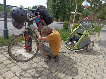 My ale hned za mostem zastavili u samoobslužného kiosku pro opravu kola. Bylo již potřeba začít řešit cvakání, které se s každým šlápnutím čím dál tím hlasitěji ozývalo ze středu kola. Je paráda, že tyto opravné kiosky podél cyklostezky sem a tam jsou a nejsou vypleněny jako ty v Praze. Tady žádné zásadní nářadí nechybí, ale ocelová lanka, na kterých jsou přidělaná, jsou na můj vkus krátká a středová osa nízko. Nakonec jsem to ale zvládl a krátkým sranda-imbusem, (zrovna tím, který jako jediný s sebou v dost těžké sadě nářadí nemám) střed utáhl a zároveň si všiml, že jeden šroub spojující mezi sebou jednotlivá ozubená kola přední přehazovačky chybí a zbylých 5 by chybělo za chvili. Tak jsem je utáhl taky a kolo projel. Bohužel cvakalo dál... Takže děti do vozíku a jedeme na nejbližší dětské hřiště, kde jsem zbytek rodiny nechal, abych se vrátil párset metrů do cykloservisu. Tam mi slečna pokladní řekla, že má moc kol a málo lidí, ať jedu do servisu za dalších 5 km. Nedal jsem se a začal žadonit, že si jsem jistý, že stačí jen něco utáhnout. Zrovna šel kolem šéf servisu, ten sedl na kolo a projel ho. Usoudil, že to bude nur klein Problem a zkusil utáhnout šrouby na pedálech. Znovu projel a zjistil, že to nepomohlo. Tak vzal nejdelší imbus, jaký jsem kdy viděl, a utáhl střed. To zabralo! Poučení z příběhu je opačné, než z příběhu s brašnou. Když to nejde, zkuste to větší silou nebo větším nářadím.