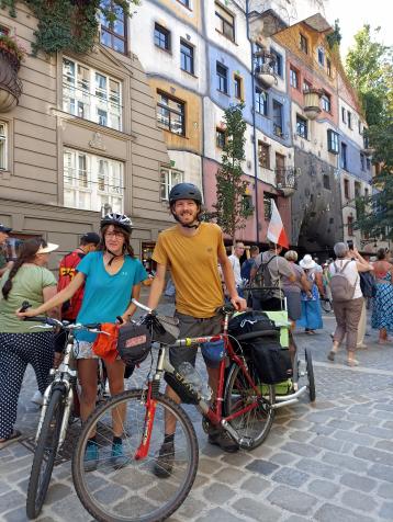 Odtamtud nám zbývalo jen asi 100 metrů, abychom se dnes ve 14 hodin ubytovali pod střechou. Teď proběhne spánek dětí a následně prohlídka města bez kol.