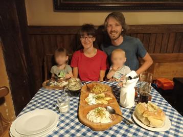 Na večeři tam jsme se těšili celou cestu. Ale dlouho jsme tam nebyli, tak jsme byli v napětí, jestli kvalita služeb od té doby neklesla. Naštěstí po včerejšku můžeme prohlásit, že rozhodně ne! Dokonalá česnečka v chlebu, skvělé halušky i pirohy, řezané pivo skutečně řezané, ne míchané, pro děti mléko. I Madlenčiny šišky s mákem a s ořechy, které si vymyslela ještě předtím, než jsme tam šli, a oni je fakt měli. Dokonalé!