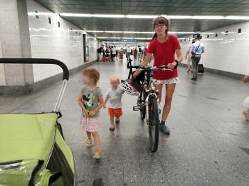 V Praze jsme se museli vypořádat s tím, že nádraží je sice bezbariérové, ale nějak se nepočítalo s tím, že by vozíčkáři jezdili na dvojkriplkárce. S dvojvozíkem jsme se nevešli do výtahu ani na eskalátor. Takže abychom se dostali na dětské hřiště v Sherwoodu před nádražím, nezbylo než postupně odnosit děti, kola a vozík po schodech.